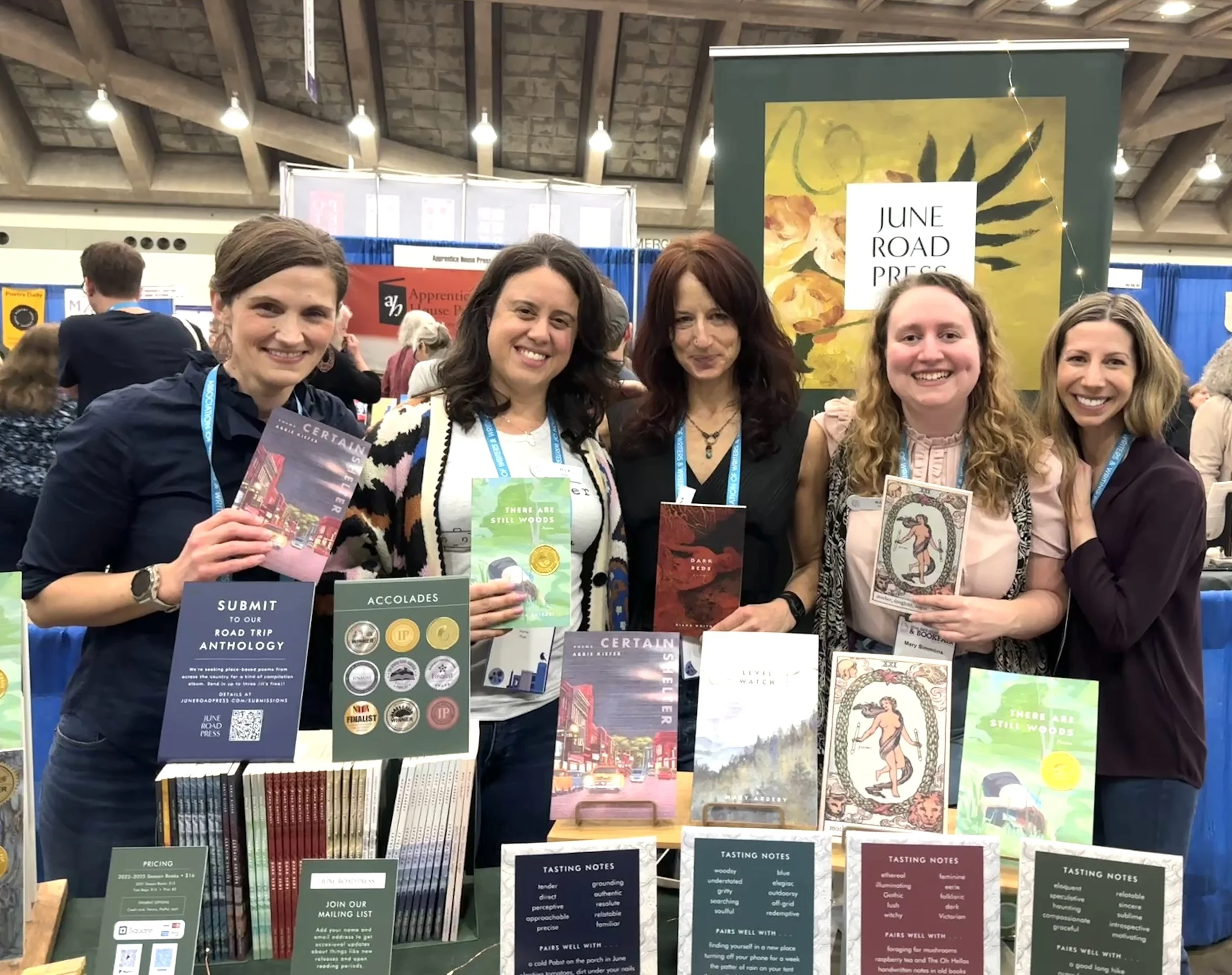 Above: The June Road Press table at AWP in Kansas City in 2024, with (left to right) authors Hannah Lee Jones and Diane Lowell Wilder, press editor Sara Arnold, and authors Mariella Saavedra Carquin and Hila Ratzabi.
